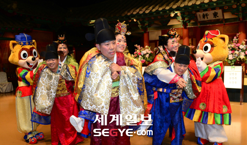 26일 서울 송파구 잠실 롯데월드 민속박물관에서 결혼식을 올리지 못한 다문화 가정 부부 3쌍의 합동 전통혼례가 진행되고 있는 가운데 신랑들이 신부를 업고 있다.