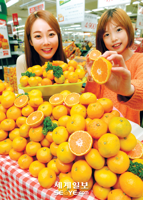 26일 롯데마트 서울 행당역점에서 모델들이 제주에서 올해 처음으로 수확한 노지 감귤을 선보이고 있다. 노지 감귤은 비닐하우스가 아니라 밭에서 햇볕을 온전히 받으며 자란 감귤을 말한다.