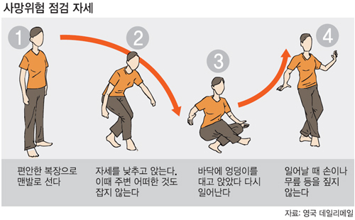 6년 내 사망할 확률 2배나 높아 앉았다 일어나는 간단한 동작만으로 사망위험을 예측할 수 있다는 연구결과가 나왔다.