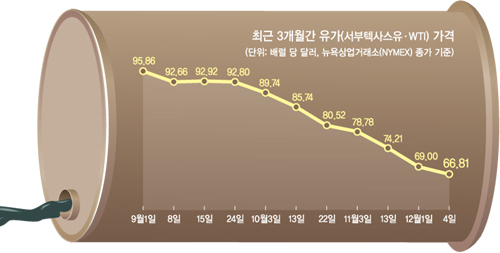 유가가 최근 큰 폭으로 떨어지고 있다. 지난 7월까지 배럴당 100달러가 넘었던 서부텍사스산원유(WTI)는 최근 70달러 아래로 떨어졌다. 오펙(석유수출국기구)에서 원유 생산량을 감산하지 않기로 결정하면서 초과 공급에 따른 우려가 유가 하락세를 부추겼다. 유가 하락을 놓고는 선진국과 에너지 부국 간에 희비가 엇갈리고, 주식시장에서도 업종별 수혜가 갈린다. 석유 수입국 한국으로서는 수입 단가 하락에 따른 비용 감소 요인은 존재하지만 세계경제 위축에 따른 부정적인 효과도 상존할 전망이다. 금리 추가 인하 가능성도 제기되고 있다.