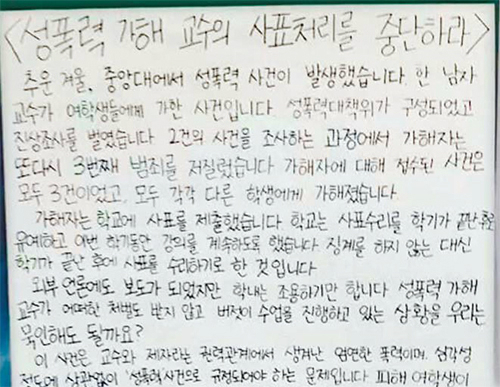 학생들은 A교수를 규탄하는 대자보를 잇달아 붙이며 학교 측의 성의 있는 자세를 요구하고 있다. 정치국제학과 이재정(20·여)씨는 지난 9일 ‘성폭력 가해 교수의 사표 처리를 중단하라’는 제목의 대자보를 통해 ‘가해자는 또다시 3번째 범죄를 저질렀지만 학교는 징계를 하지 않는 대신 학기가 끝난 후 사표를 수리하기로 했다. 성폭력 가해 교수가 처벌도 받지 않고 버젓이 수업을 진행하는 상황’이라고 비판했다. 이어 ‘성폭력 사건은 피해자뿐 아니라 공동체 구성원 모두에게 상처를 주는 일이다. 강의를 하도록 방치한 것은 공동체 구성원 모두에게 가해진 또 다른 폭력’이라며 ‘대학본부는 수업 진행을 중단하고 해당 수업을 들은 학생들에게 사과하라’고 주장했다. 이 대자보는 12일 떼어졌다. 또 다른 학생도 A교수를 규탄하는 대자보를 붙였지만. 학교측은 별다른 조치를 취하지 않고 있다.