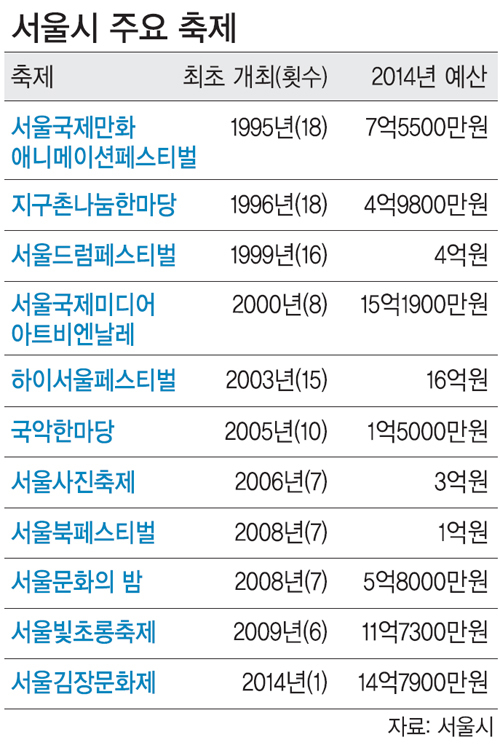 서울시는 체계적인 축제 관리를 위해 브랜드, 개최 나이, 예산 등에 따라 대표 문화축제 11개를 선정했다. 또 계절별로 서울드럼페스티벌(봄), 서울문화의 밤(여름), 하이서울페스티벌(가을), 서울김장문화제(겨울)를 4대 브랜드 문화축제로 삼아 육성할 계획이다. 서울시 관계자는 “시민 참여를 확대하고, 관리 시스템을 효율적으로 개선해 서울 축제의 관광자원화를 촉진할 것”이라고 말했다.