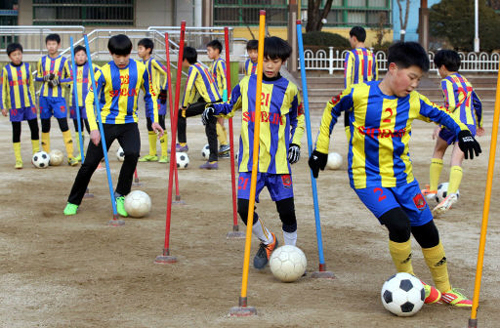 신북FC 유소년 선수들이 영하의 기온을 보인 28일 서울 신북초등학교 운동장에서 축구공을 몰며 막대 사이를 통과하는 드리블 훈련에 여념이 없다.