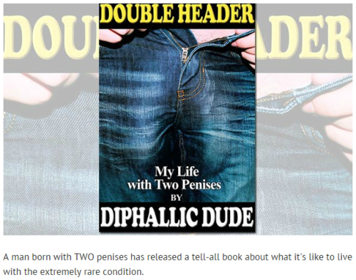 태어날 때부터 성기 2개가 달린 ‘이음경체(二陰莖體)’ 증세를 겪는 20대 남성이 자신의 존재를 드러내 네티즌들의 눈길을 끌고 있다. 남성은 자신을 가리켜 우스갯소리로 ‘더블헤더(Double Header)’라 부른다.