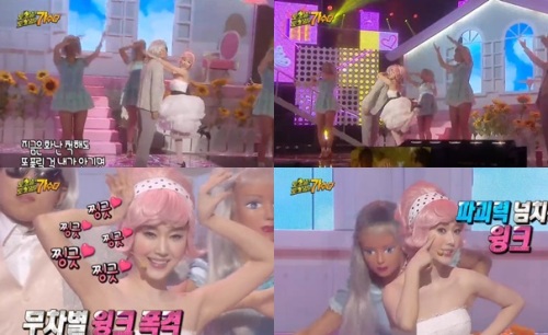 이정현은 '와' 무대에 이어 '줄래'를 열창했다. 인형의 집 세트장과 함께 핑크색 가발, 댄서들의 가면까지 모든 무대는 이정현을 '바비인형'으로 만들어줬다.