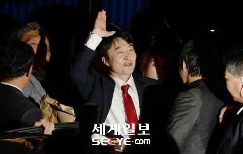 이석기 전 의원(가운데)이 국회 의원회관 앞에서 체포동의안 통과로 구인영장 집행에 나선 국정원 직원들의 호송차량에 오르면서 통진당(해산된) 당원에게 손을 들어 인사하고 있다.