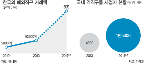 23일 국내 최대 쇼핑몰 솔루션 업체인 카페24에 따르면 역직구몰 사업자는 2013년 말 4300개에서 지난해 말 1만5000개로 1년 새 1만700개(249%) 늘었다. 카페24를 통하지 않고 역직구 사업에 나서는 곳까지 고려하면 매달 최소 1000개 이상의 역직구몰이 새로 생기고 있는 것으로 추정된다.