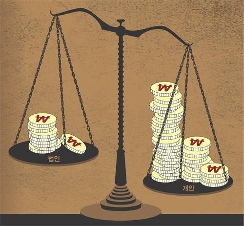 조세저항 민심을 더욱 부추기는 것은 조세 형평성 문제다. 법인보다 개인의 세 부담을 키우는 흐름이 민심을 한층 더 자극하고 있다. 실효세율 기준으로 2008년 20.5%이던 법인세율은 2013년 16.0%로 4.5%포인트 낮아진 반면 근로소득자의 소득세는 같은 기간 4.0%에서 4.5%로 0.5%포인트 올랐다. 2008년 13.9%이던 개인 종합소득세율은 2009년 13.1%로 소폭 하락했다가 2013년 다시 13.9%로 올라갔다. 결국 ‘증세 없는 복지’는 법인들의 세 부담은 줄이고 개인들의 세 부담을 늘리는 방향으로 가고 있다.