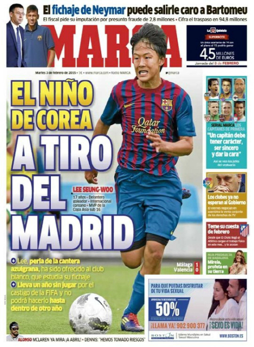 축구선수 이승우가 스페인의 유력지 마르카 1면을 장식해 시선을 모았다 .