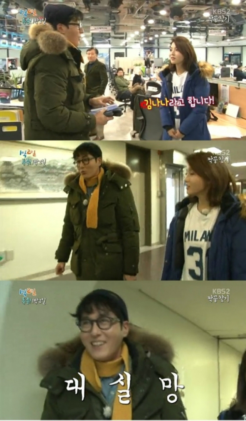 8일 오후 4시50분 방송된 KBS2 '해피선데이-1박2일'에서는 보도국에서 자신의 파트너를 찾아 나선 김주혁의 모습이 전파를 탔다. 이날 김주혁은 이어 자신의 파트너로 정해져 있던 김나나 기자와 만나 좋아하는 모습을 보였다.