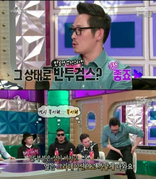 이어 김풍은 "15데니아 스타킹은 입자가 굉장히 가늘어 다리가 예뻐 보인다"고 답했고, 이홍기는 "전 스타킹 안신은 여자가 좋다"고 말해 주위를 폭소케 했다.