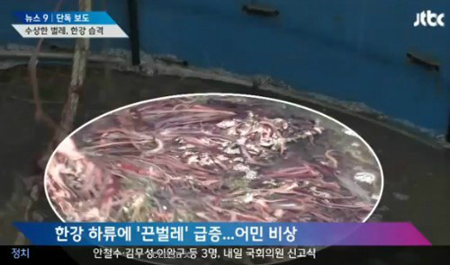 경기도 고양시와 국립수산과학연구소 등은 26일 지난달부터 한강 가양대교 하류~자유로 장월 나들목 30km 구간에서 끈벌레가 대량으로 잡히고 있다고 밝혔다. 발견된 끈벌레는 20~30cm의 크기로 포식성이 강해 한강 하류 어민들에게 큰 피해를 입히고 있다.