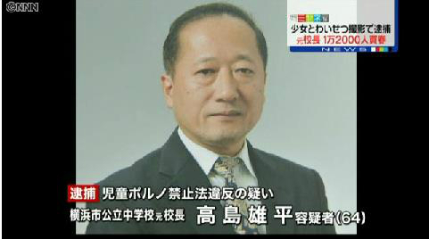 8일 일본 민영방송인 닛테레(日テレ)는 필리핀에서 1만 2000명과 성매매 후 사진을 촬영한 요코하마시 前공립중학교 교장 다카시마 유헤이(64)가 구속됐다고 보도했다.