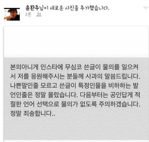 윤완주가 일베 용어를 사용해 논란이 된 가운데 자신의 SNS에 사과문을 올렸다.