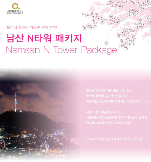 ''남산 N타워 패키지''는 낭만적인 봄 여행을 꿈꾸는 고객들을 위한 전용 패키지이다. 4월 첫째 주 많은 인파가 아름답게 피는 벚꽃 감상을 위하여 남산N타워로 몰릴 것으로 예상된 다. 남산N타워는 남산 공원 산책로를 걸으며 완연한 봄의 정취를 즐기기에 제격이다. 벚꽃으로 가득한 산책로와 남산의 절경을 느낄 수 있다.