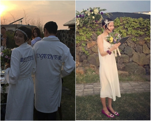 공개된 사진 속 김나영은 흰색드레스에 핑크색 플렛슈즈, 머리띠를 한 독특한 웨딩드레스를 입고 있다.