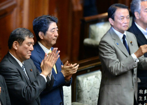 | 16일 일본 중의원 본회의에서 안보 관련 법안이 통과되자 아베 신조 일본 총리(왼쪽 두번째)와 아소 다로 부총리 겸 재무상(〃 세번째), 이시바 시게루 지방창생담당상(〃 첫 번째)이 자리에서 일어나 박수를 치고 있다. 연합 |