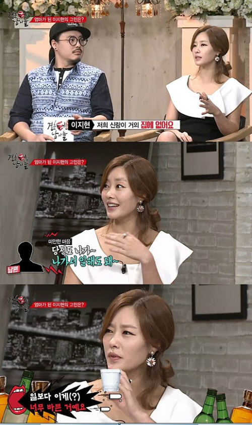 이지현은 "새벽에 술 먹고 늦게 들어오면 밉지 않냐?"고 묻는 질문에 "밉다. 얄밉다. 하지만 같이 있는 시간이 많이 없다. 그럼 그 감정도 화가 났다가 혼자 수그러들었다가 한다. 시간이 지나면서 화도 작아지고 미움도 작아진다"며 "그렇게 해야지 내가 편하고 우리 관계가 편해진다"고 털어놨다.
