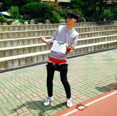 공개된 사진에는 Mnet ‘쇼미더머니4’ 1차 오디션 당시 블랙넛이 바지를 벗고 펼친 퍼포먼스 장면을 패러디한 의정부고 학생의 모습이 담겨있다.