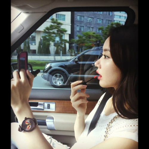 한그루는 립스틱을 바르고 있는 모습에서도 패션센스가 돋보이는데 스타일 포인트로 패션 잡화 브랜드인 '라빠레뜨(lapalette)’의 시계를 화이트 블라우스와 매치해 감각적인 스타일링을 완성했다.