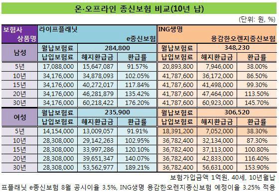 조기사망에 따른 보험금을 보장받기 위해 가입하는 종신보험 중 가장 저렴한 상품으로 어필, 인기몰이를 하고 있는 ING생명의 ‘저해지종신보험’과 온라인을 통해 소비자가 직접 가입하는 교보라이프플래닛 종신보험 중 소비자에게 더 저렴한 상품은 온라인 보험인 것으로 나타났다.