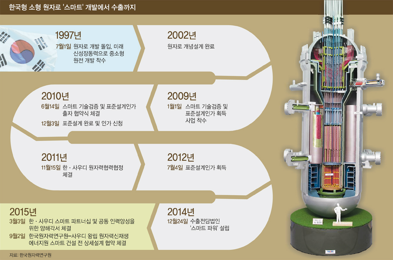 지난 18일 원자력연구원 대전 본원에서 만난 김긍구 스마트 개발사업단장도 고심이 깊어 보였다. 김 단장은 “사우디에 스마트 원전을 건설하려면 표준설계 인가를 획득할 당시 우리가 예상치 못한 조건을 만족시켜야 하는데, 물 대신 공기로 냉각해야 하는 문제부터 풀어야 한다”며 “현지 인허가를 받는 일에도 신경을 써야 한다”고 말했다. 공기 냉각 방식은 내륙에 세워진 화력발전소에서 일반적으로 사용되고 있어 이를 응용하면 기술적인 난관은 없을 것으로 보인다. 인허가도 한국 기준을 따르기로 합의한 만큼 헤쳐나가기 어렵지 않을 전망이다.