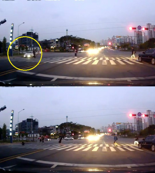 강아지 주인으로 추정되는 두 사람이 보행 신호가 켜지자 빠른 걸음으로 건넌다. 강아지는 목줄을 착용하지 않은 채 주인을 뒤따르고 있었다. 이때 우회전으로 들어오던 한 승용차가 속도를 멈추지 않고 횡단보도를 지나쳤고, 강아지는 피할 틈도 없이 차에 치였다.