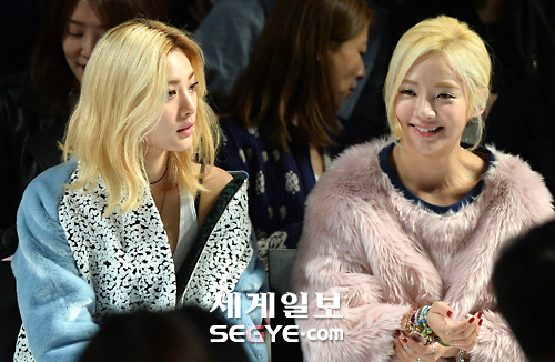 가수 나나, 효연이 16일 오전 서울 동대문디자인플라자(DDP)에서 열린 헤라 서울패션위크 S/S 2015-프리마돈나 컬렉션에 참석해 미소를 짓고 있다.