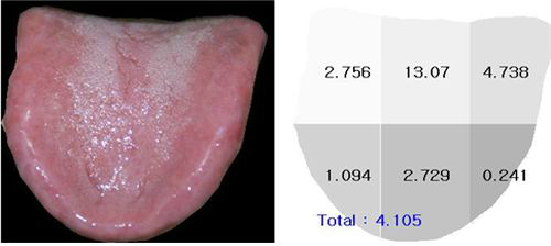 위 사진은 디지털 설진기로 본 구강작열감 증후군 환자의 혀 사진이다. 구강작열감 증후군의 주 증상인 혀 표면의 반질거림과 갈라짐을 확인할 수 있다. 이는 설태의 부족을 나타내는 것으로 우측 사진에 나타난 설태 분포도를 보면 평균 4%로 확인할 수 있는데 설태 정상치가 33%임을 감안하면 매우 낮은 수치임을 알 수 있다.