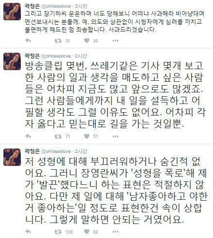 2일 오후 곽정은은 자신의 트위터에 "저 성형에 대해 부끄러워 하거나 숨긴적 없어요. 그러니 장영란 씨가 '성형을 폭로'해 제가 '발끈'했다느니 하는 표현은 적절하지 않아요"라는 문장으로 시작되는 글을 게재했다.
