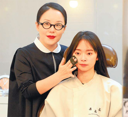 | 정샘물 원장이 지난달 30일 서울 청담동 정샘물 인스피레이션 2층 메이크업실에서 한 여성을 메이크업해주고 있다. 이제원 기자 |