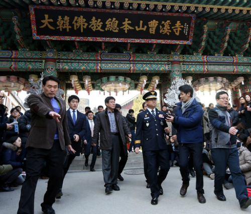 | 구은수 서울지방경찰청장이 8일 한상균 민주노총 위원장이 피신해 있는 서울 종로구 조계사 일주문 앞에서 한 위원장의 자진 퇴거에 협조해 달라는 요청서를 낭독한 뒤 걸어나오고 있다. 경찰은 한 위원장의 퇴거 시한을 9일 오후 4시로 최후 통첩했다. 남제현 기자 |