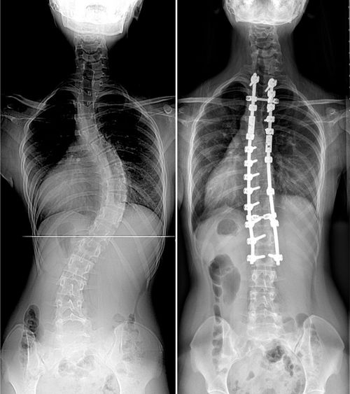 | 이중 흉추 청소년기 특발성 척추측만증 수술 전 후 수술당시 14세 여아사진으로 수술 전 상부흉추 36도, 하부흉추 62도의 측만증 소견. 수술 후 척추 측만증이 잘 교정되었고, 어깨 높이 균형도 양쪽이 대칭적으로 잘 유지 되고 있는 소견을 보이고 있다. |