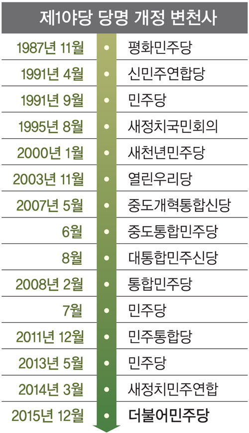 새정치연합이 여당 시절인 2007년 1년 동안 중도개혁통합신당, 중도통합민주당, 대통합민주신당 당명이 등장했고 야당 시절인 2012년 총선, 대선에선 민주통합당, 2014년 지방선거 때는 새정치민주연합으로 당의 문패를 갈아치웠다. 양승함 연세대 교수는 “선거에 앞서 잦은 당명 개정은 국민적 지지와 이목을 끌기 위한 선거용 이벤트에 불과하다”고 지적했다.