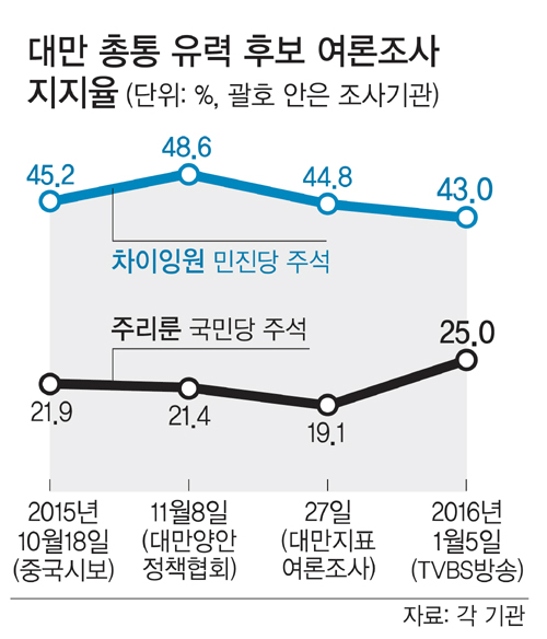 이번 선거에서는 야당인 민주진보당(민진당)의 차이잉원(蔡英文·60·여) 후보와 집권 여당인 국민당의 주리룬(朱立倫·55) 후보, 친민당의 쑹추위(宋楚瑜·74) 후보가 경합하고 있으나 차이 후보가 다른 후보들을 각종 여론조사에서 20%포인트 이상의 격차로 앞선 것으로 조사됐다. 대만 연합보와 타이베이타임스 등 대만 언론매체들은 차이 후보가 300만표 안팎의 차이로 승리해 8년 만의 여야 정권 교체를 이룰 것으로 전망했다.