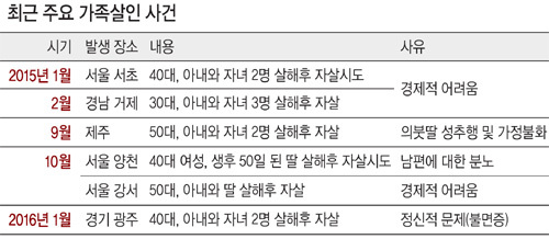 서울의 50대 가장이 말기암 아내와 특목고생 딸을 살해한 뒤 자살하고 제주에서는 50대 남편이 아내와 자녀 둘을 살해한 뒤 스스로 목숨을 끊었다.