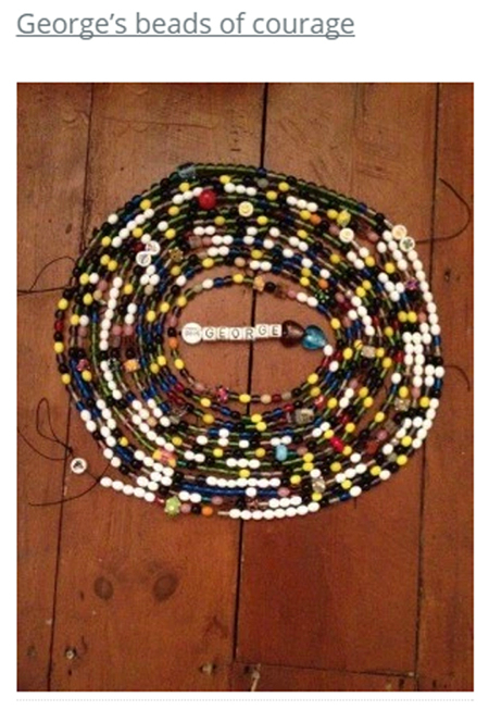 흰 구슬은 화학치료다. 노란 구슬은 병원에서 보낸 밤이다. 분홍색 구슬은 마취제를 주사한 날이고, 빨간 구슬은 수혈이다. ‘요추 천자’ 후 한 시간 이상 누웠던 때를 뜻하는 구슬도 있다. 요추 천자는 백혈병 환자들이 척추 아랫부분에 바늘을 꽂아 골수를 뽑는 방식이다. 그렇게 꿰어온 구슬이 876개다.