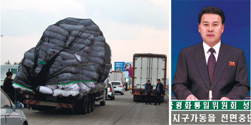 | 북한이 우리 정부의 개성공단 가동 전면중단에 맞서 공단 내 남측 인원 추방 및 자산 동결을 선언한 11일 경기도 파주 임진각 입구 도로에서 공단을 다녀온 트럭에 가득 실린 화물이 무게를 이기지 못해 옆으로 기울어지고 있다.(왼쪽 사진) 조선중앙TV가 이날 개성공단 폐쇄 등의 내용을 담은 조국평화통일위원회 성명을 보도하고 있다. 파주=연합뉴스 |