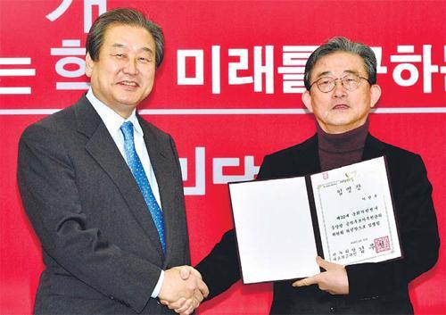 | 새누리당 김무성 대표(왼쪽)가 지난 11일 서울 여의도 당사에서 이한구 공천관리위원장에게 임명장을 수여한 뒤 악수를 하고 있다. 세계일보 자료사진 |