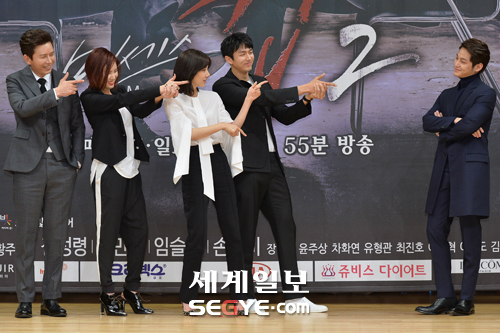 배우 김민종, 김성령, 손담비, 임슬옹, 김범(왼쪽부터)이 4일 오후 서울 양천구 목동 SBS사옥에서 진행된 주말드라마 '미세스 캅2' 제작발표회에 참석해 포즈를 취하고 있다.