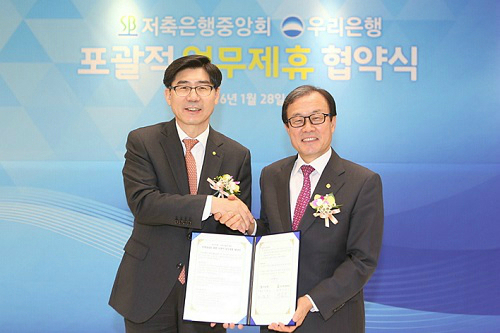 | 지난 1월 28일 서울시 중구 우리은행 본점에서 이광구 우리은행장(왼쪽)과 이순우 저축은행중앙회장이 연계사업 추진을 위한 포괄적 업무제휴를 체결 후 악수를 하고 있다. 사진=우리은행 |