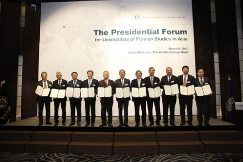 이날 오전 서울 웨스틴 조선호텔에서 열린 아시아 지역 외국어대 총장 포럼 및 협의체 발족식에는 한국외대를 비롯해 △부산·대구·사이버한국외대 △중국 북경·상해외국어대 △일본 동경·교토외국어대 △몽골인문대 △베트남 국립하노이외국어대 △우즈베키스탄 사마르칸트외국어대 등 6개국 외국어대 총장 11명이 참석해 외국어 교육 진흥 방안을 논의했다.