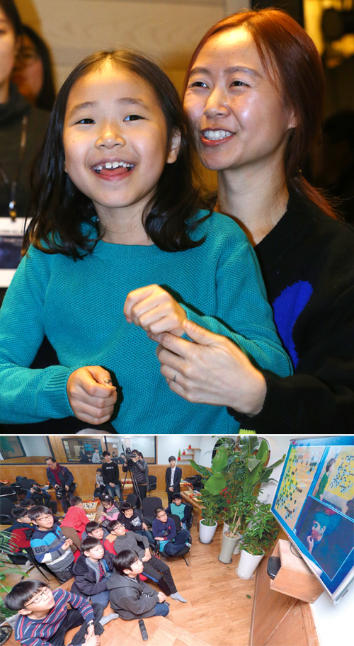 | 사랑하는 가족도… 바둑 꿈나무도… 한마음 응원 10일 프로기사 이세돌 9단과 알파고의 제2국이 열린 서울 종로구 포시즌스 호텔의 공개해설장에서 이 9단의 부인 김현진씨와 외동딸 혜림양이 중계방송을 보며 응원하고 있다.(아래 사진) 같은 날 서울 성동구 행당동 이세돌 바둑연구소에서 원생들도 대국 중계방송을 시청하고 있다. 이제원 기자, 연합뉴스 |