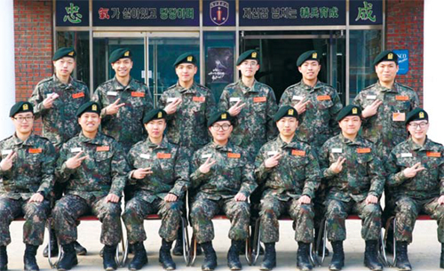 | 지난달 1일 군에 입대한 가수 겸 배우 이승기(뒷줄 왼쪽 두 번째)가 육군훈련소 동기들과 기념촬영을 하고 있다. 이승기는 21일 특수전사령부에 배치될 예정이다. 육군 제공 |