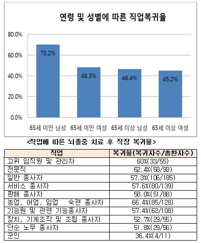 이들의 일터 복귀 여부를 가른 것은 환자의 성별과 나이가 결정적 영향을 미치는 것으로 나타났다. 65세 미만 남성의 경우 70.2%가 일을 되찾았지만, 여성은 같은 조건에서 48.3%에 불과해 큰 차이를 보였다. 65세를 넘는 경우 남녀 모두 일터로 되돌아가는 비율이 절반(남성 46.4%, 여성 45.2%)을 밑돌았다.