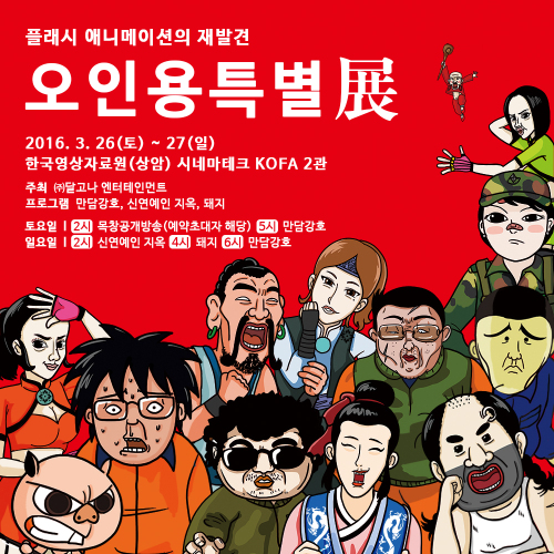 웹 플랫폼 기반 애니메이션 업체 좀바라TV는 서울 상암동 한국영상자료원에서 26, 27일 ‘오인용 특별전’을 개최했다. 이번 ‘오인용 특별전’은 2000년대 초반부터 플래시 툴을 사용해 애니메이션을 만들어 왔던 오인용의 작품을 재조명하는 특별전이었다. 상영된 작품은 ‘만담강호’, ‘신연예인 지옥’, ‘돼지’ 등의 애니메이션이다.