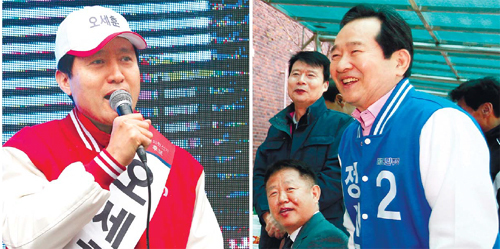 | 오세훈·정세균 ‘유세전’ 4·13총선 서울 종로구 선거구에 나서는 새누리당 오세훈 후보(왼쪽)와 더불어민주당 정세균 후보가 각각 창신동과 필운동 매동초등학교에서 유세를 하고 있다. 연합뉴스 |
