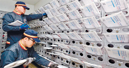 | “공약 꼭 확인하세요” 제20대 국회의원 선거가 10일 앞으로 다가온 3일 오전 서울 마포구의 한 아파트에서 집배원들이 선거공보물을 우편함에 넣고 있다. 남정탁 기자 |