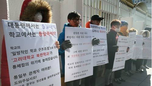 | 고려대 북한학과 학생들이 지난 2월15일 서울 세종로 정부서울청사 후문에서 학과 통·폐합을 반대하며 시위를 벌이고 있다. |