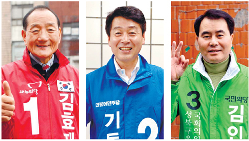 | 서울 성북을에 출마한 새누리당 김효재, 더불어민주당 기동민, 국민의당 김인원 후보(왼쪽부터)가 7일 오전 출근길 유세를 하며 환하게 웃고 있다. 성북을에서는 김효재 후보와 기동민 후보가 여론조사에서 오차범위 내 접전 중이다. 남정탁 기자 |